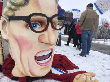 An exagerated costume of premier Kathleen Wynne was part of the demonstration along with union flags and protest signs. The costume, according to OPSEU executive board member Philip Shearer, is meant to drive home a point.