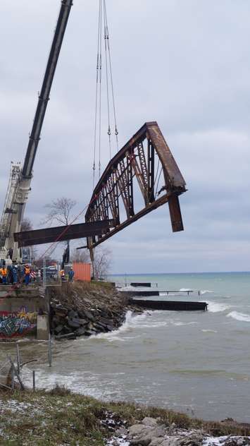 Sarnia Council voted unanimously in September to salvage the trusses of the historic span during its removal, which were relocated Thursday to Mike Weir Park to possibly be preserved in the future.