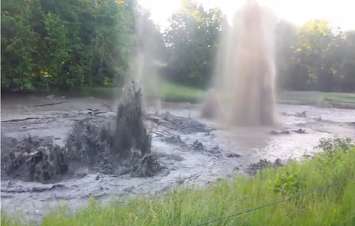 Video posted to YouTube shows a churning pond at Indian Hills Golf Course with geysers of gas and water shooting high into the air.