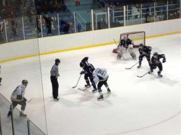 Aidan Hughes allowed six goals on 28 St. Thomas shots while Dan Black stopped 20 of Sarnia's 22 shots.