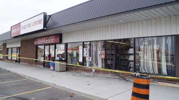 The scene at Sarnia's Fabricland after a vehicle jumped the curb and hit the front glass window.