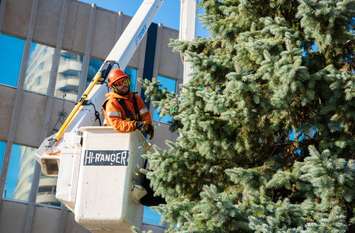The City Hall Christmas tree went in today, with City forestry crews working to remove, relocate and decorate the donated 40-foot blue spruce.