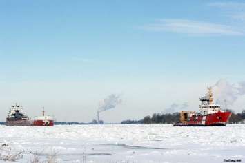 CCGS Samuel Risley passes by Port Lambton on the St. Clair River to provide icebreaking assistance to commercial shipping. Photo courtesy of Richard Dompierre.