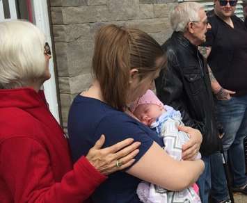 (Left to right) Sarnia-Lambton MADD President Natalie Leduc joins Kim MacIntosh, baby Paige and Ralph MacIntosh to place purple ribbons at Mitton and George St. May 24, 2017 (Photo by Melanie Irwin)