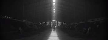 The black and white commercial depicts a typical day on the farm, from milking cows to hauling hay and feeding calves.