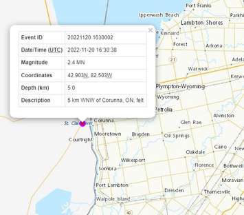 The federal agency said the event took place across the St. Clair River in Michigan at around 11:30 a.m. (4:30 p.m. UTC) but it could be felt in areas such as Corunna and Mooretown.