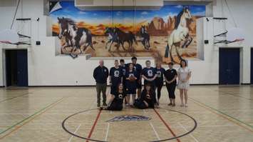 Alexander Mackenzie's basketball team with teachers Sarah Hotke and Mark MacDonald, and representatives from Mainstreet Credit Union. May 30, 2023. (Photo by Natalia Vega)