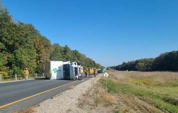 Provincial police closed the westbound lanes of Highway 402 at Kerwood Road Tuesday afternoon after a commercial vehicle rolled onto its side.