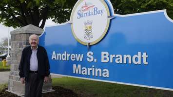 Sarnia Mayor Mike Bradley joins Andy Brandt in front of a new sign bearing his name. May 30, 2019 Photo by Melanie Irwin