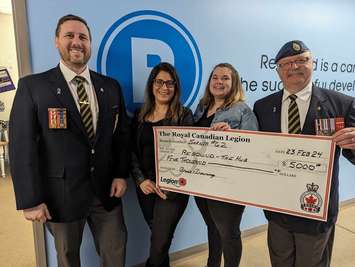 Ladies' Auxiliary President Mary Ann Buuntrock, River City Vineyard's Sarah Abraham, Community Services Officer Bruce Browning and Legion President Ron Realesmith. February 23, 2024 (Image courtesy of Sarnia Legion Branch 62 via. Facebook.)