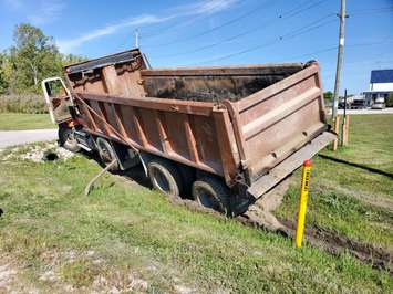 Police said the truck was travelling northbound on Scott Road when the driver failed to navigate a turn and hit the ditch. Several attempts to reverse out of the ditch were not successful.