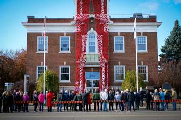 The view of a poppy project from the Strathroy cenotaph. The poppy design is a trademark of The Royal Canadian Legion (Dominion Command). Image courtesy of the Museum Strathroy-Caradoc Facebook page.