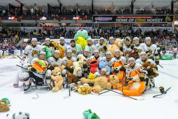 Sarnia Sting host Saginaw in annual Teddy Bear Toss game Sunday, Dec 1, 2024. Photo by Metcalfe Photography.