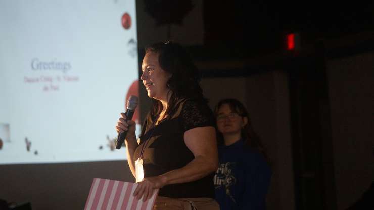 Representative from St. Vincent de Paul Society speaks to St. Pat's students during pep rally. December 3, 2024. (Photo by Natalia Vega)