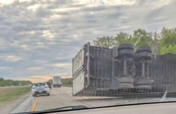 At around 7:30 a.m., a transport truck rolled onto its side on the eastbound highway near Mandaumin Road, blocking traffic.
