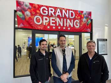 Doctors Jason Hall, Alan Poole and Mike Rondinelli snip the ribbon while St. Clair Township Mayor Jeff Agar looks on at the grand opening of the St. Clair Medical Centre in Corunna. October 21, 2025 Blackburn Media photo by Melanie Irwin.