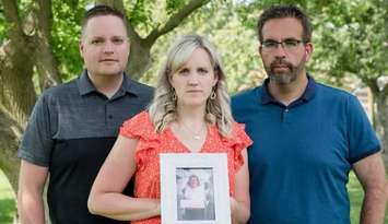 Brent Campbell, Alicia Guthrie and Joel Campbell hold a photo of their mother Fenny Campbell. Photo taken by Lynette Brown.
