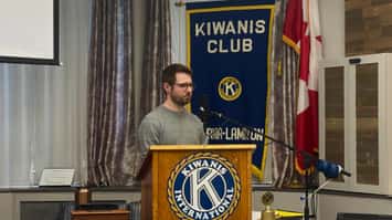Brendan Wiley speaking at a Kiwanis Club of Sarnia-Lambton Golden K meeting on March 17, 2026.