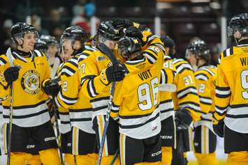 Ty Voit scored twice in the victory and became the second OHLer to crack 100 points on the season, Sandis Vilmanis also added a pair of goals, and goaltender Nicholas Surzycia turned away 28 shots for his 16th win of the campaign.