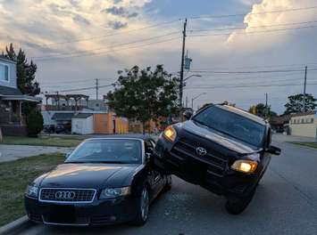 They found a black SUV with its front passenger side resting atop the hood and windshield of a parked vehicle.